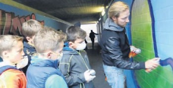 Künstler zeigt wie es geht: Der Graffiti-Künstler David „Jackules“ Schmidt (rechts) beim Workshop im vergangenen Jahr. Foto: nh