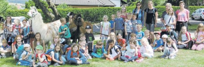 Hatten viel Spaß in der Ferienbetreuung: Die Kinder mit den Alpakas von Familie Ringk aus Berndshausen. Mit dabei waren die Betreuerinnen Damaris Schneider (hinten von links), Brigitte Skirde, Karina Bamberger, Lucia Hofmann und Lena Tasler. Foto: nh