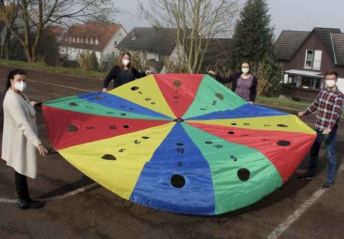 Da gibt es zum Beispiel das bunte Schwungtuch. Das kann beispielsweise für die Spiele „Ball oben halten“ und „Löcheriges Tuch“ genutzt werden. Und ist dabei völlig coronaregelkonform, denn der Abstand kann mit den Halteschlaufen am Rand bestens eingehalten werden. Das Tuch kommt bei den Grundschülern aller Altersklassen gut an und machte beim Ausprobieren auf dem Schulhof mächtig Eindruck.