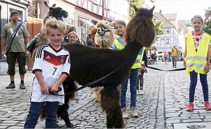 Auch Familie Ringk aus Knüllwald war die vergangenen vier Jahre bei dem Spielfest. „Ist doch klar, dass wir dann auch die Rallye mitmachen“, sagt Gerhard Ringk. Mit sieben Kindern ging es bei der Rallye an den Start. Dabei waren Ringks Enkel Lotta (2), Til (4) und Amy (7), sowie Amelie, Hanne, Pia und Annalena (alle 7), Klassenkameradinnen von Amy an der Schule am Schloth. Außerdem mit von der Partie: drei Alpakas und ein Lama aus der Herde von Gerhard Ringk. Elf der Paarhufer besitzt er mittlerweile und sie sind für die Kinder immer eine Attraktion. „Die Ruhe der Tiere überträgt sich auf die Kinder, das schafft eine ganz besondere Atmosphäre“, sagt der 60-Jährige. Die Kinder führten die Tiere selbst an der Leine durch Melsungen, natürlich unter Ringks Aufsicht.