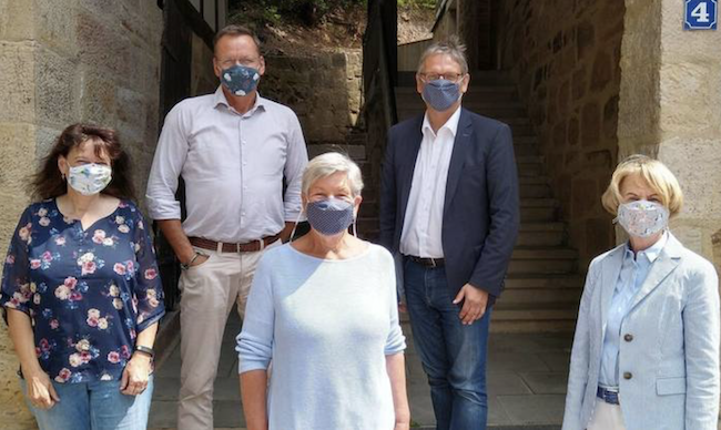 Dass ihre Masken so große Wellen schlagen, hätte Wilma Kiefer niemals gedacht. Anfang Mai hatte sie begonnen vom Fenster aus in der Melsunger Brückenstraße ihre selbst genähten Masken zu verkaufen. Einen Teil des Erlöses spendete sie nun an den „Förderverein für ein zukunftsfähiges Melsungen“. Insgesamt 1350 Euro kamen zusammen. „Die Arbeit hat eine Menge Spaß gemacht und ich habe viele tolle Leute in Melsungen kennengelernt“, erzählt Wilma Kiefer. Mit ihrer Spende unterstützt sie die aktuellen Vereins-Projekte zur Sprachförderung. Von Vereinsseite heißt es einstimmig: „Frau Kiefer und ihre Masken spielen heute ganz klar die Hauptrolle.“ Unser Bild zeigt von links Karin Plötz-Hesse (Familienbüro), Bürgermeister Markus Boucsein, Wilma Kiefer, Stefan Kördel und Ilona Braun (beide vom Förderverein für ein zukunftsfähiges Melsungen). waq
